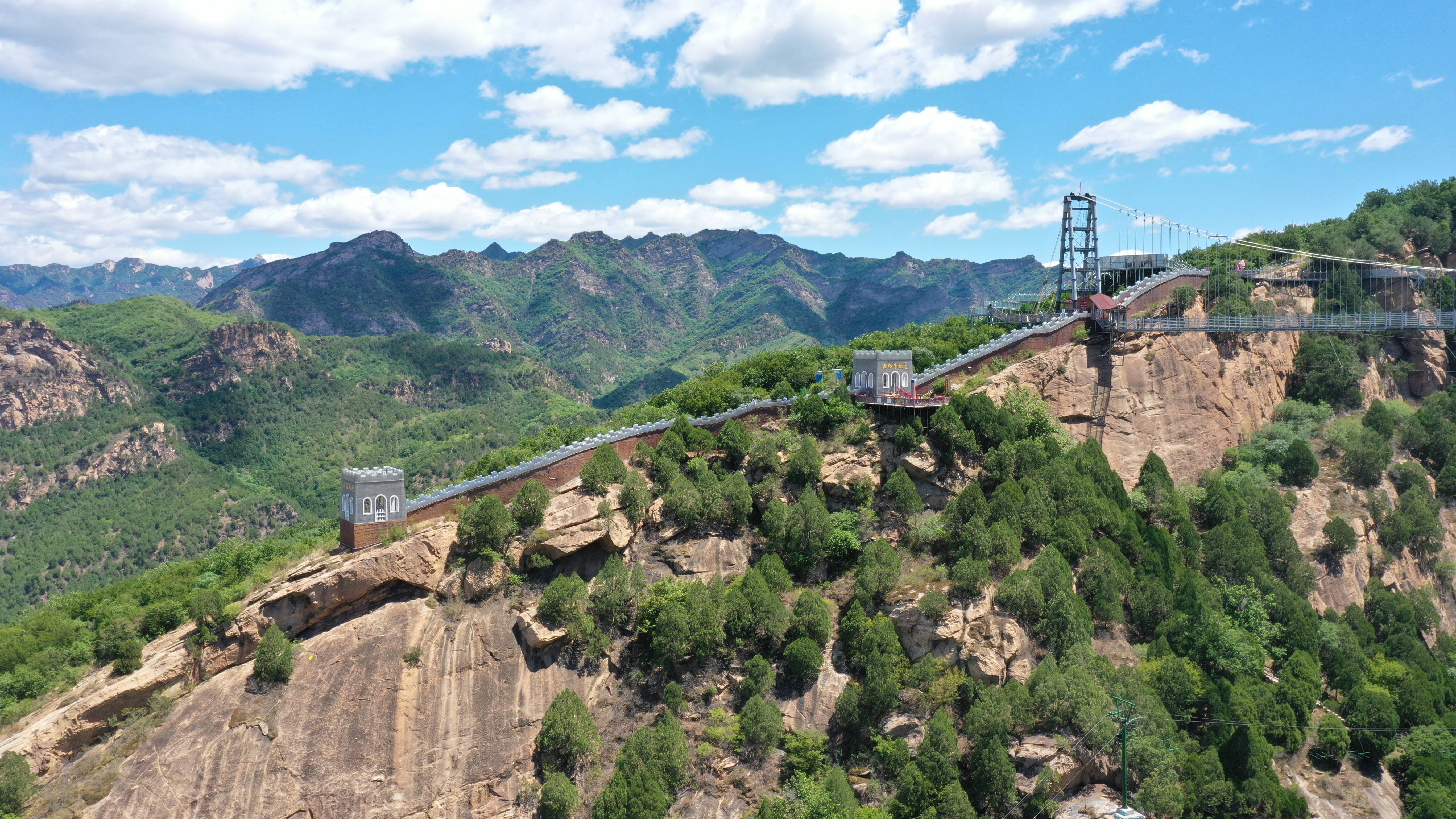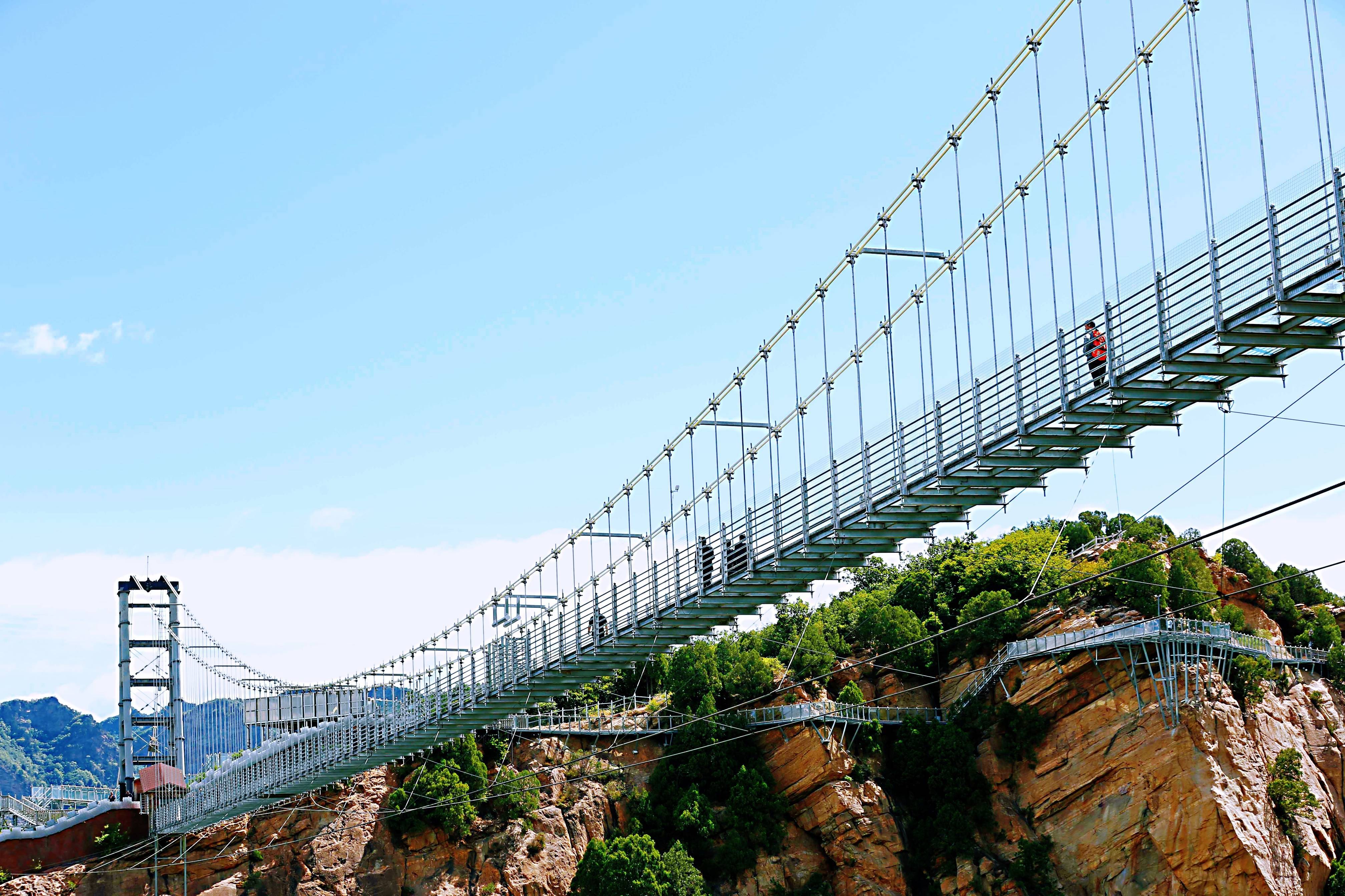 玻璃栈道盘旋在悬崖峭壁之上,掩映在青山绿树之间,漫步其上,处处惊心,是一种让人心动的浪漫。