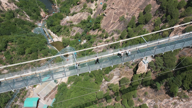 5D玻璃天桥与水晶长城遥遥相对,走在上面踩到会“碎”的玻璃,霎时让人心惊肉跳,足以挑战你的胆。