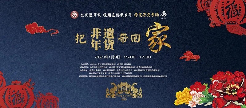 由南充市文广旅局、西充县政府主办,西充县委宣传部、西充县文化广播电视和旅游局、西充县融媒体中心承办,西充县妇女联合会、西充县文化馆、西充县图书馆等协办的2023年“文化进万家•视频直播家乡年——把非遗年货带回家”(西充专场)暨“送温暖•迎新春•贺大年”系列群众文化活动火热来袭!