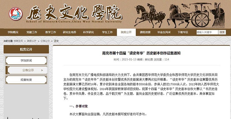 在南充市文化广播电视和旅游局的大力支持下,由共青团西华师范大学委员会和西华师范大学历史文化学院共同主办的南充市“读史年华”历史剧本创作暨优秀历史剧展演大赛再次拉开帷幕。
