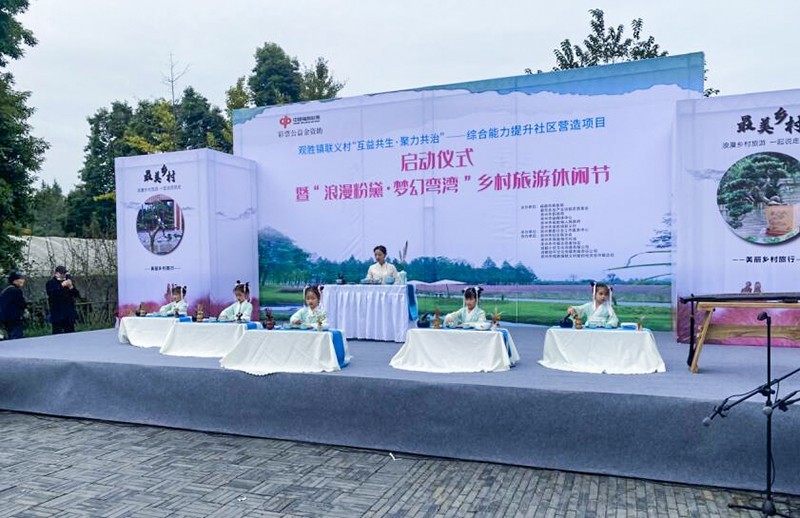 为进一步提升四川省崇州市观胜镇联义村严家弯湾以乡村休闲、旅游、度假等功能的附加值,助力第三产业发展,通过文化及旅游深度融合,依托集群效应及网红效应,营造严家弯湾的服务场景、文化场景、生态场景和共治场景,实现联义村乡村旅游知名度提升。10月17日,由成都市民政局、都市农业产业功能区管委会、崇州市民政局、崇州市融媒体中心、崇州市观胜镇人民政府、崇州市观胜镇联义村主办;崇州惠爱社会工作服务中心承办;崇州市妇女联合会、崇州市观胜镇文化站、崇州市巾帼志愿者协会、成都小钦文化传播有限公司、成都加可文化传媒有限责任公司、崇州市观胜镇联义村股份经济合作联合社协办;成都市社会组织社区和社工人才服务中心支持的观胜镇联义村“互益共生.聚力共治”——综合能力提升社区营造项目启动仪式、“浪漫粉黛.梦幻弯湾”乡村旅游休闲节、“水上乡村.踏歌而行”弯湾首届席地音乐会在观胜镇联义村5组严家弯湾顺利开展。