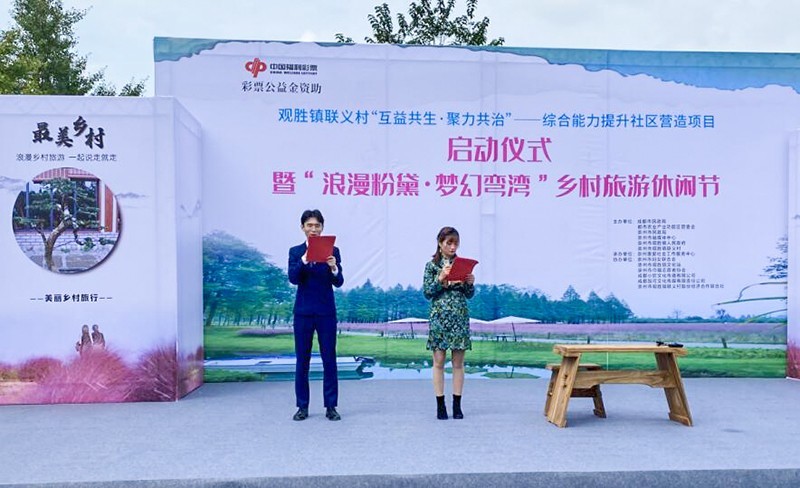 在崇州市观胜镇党委副书记,镇长余永江的宣布下,观胜镇联义村“互益共生.聚力共治”——综合能力提升社区营造项目启动仪式、“浪漫粉黛.梦幻弯湾”乡村旅游休闲节、“水上乡村.踏歌而行”弯湾首届席地音乐会正式拉开序幕。