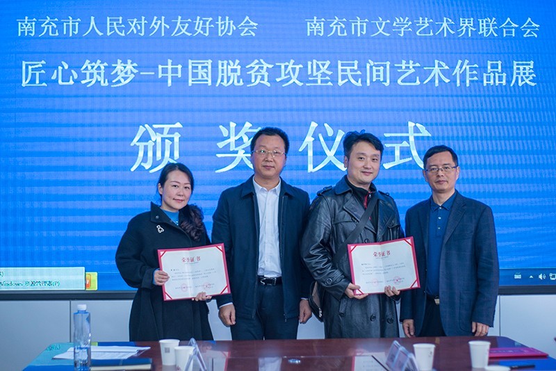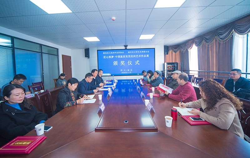11月6日,由南充市人民对外友好协会和市文学艺术界联合会共同举行“匠心筑梦—中国脱贫攻坚民间艺术作品展”颁奖仪式及作品选送赛活动总结表扬大会,数位南充民间艺人出席并获奖。市友协会长赵启、市文联副主席杨林等为他们颁奖并讲话,活动由市友协副会长邓秀珍主持。