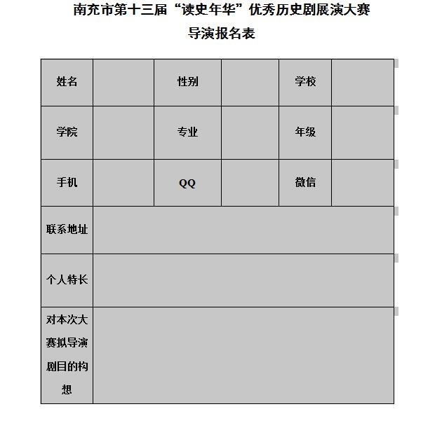 各学院学生可填写附件一:南充市第十三届“读史年华”优秀历史剧展演大赛导演报名表以附件形式发送至前缀为“dsnhlsjbcz”的163邮箱。