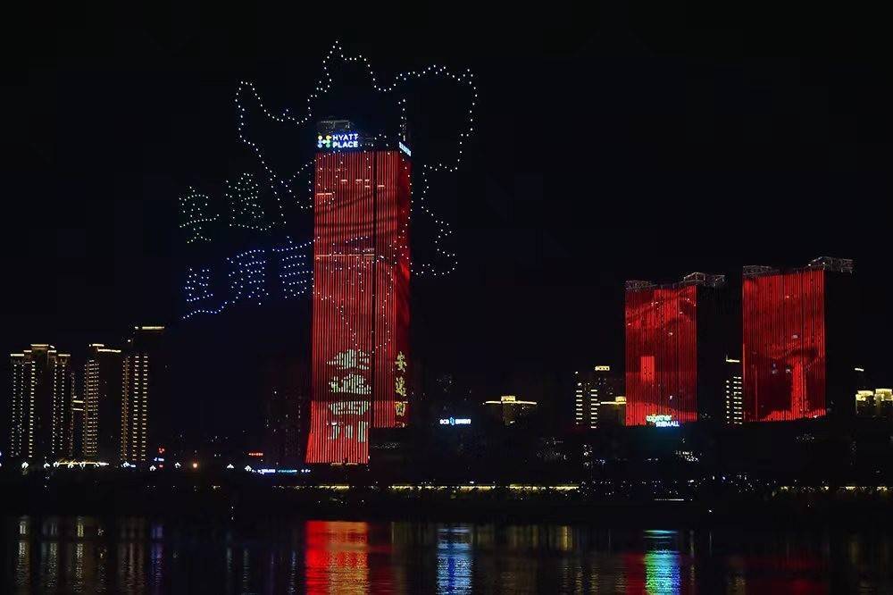 嘉陵江畔,万家灯火璀璨;丝韵苍穹,舞亮果城夜空。驶至嘉陵江南充主城段,500架无人机组成表演方阵,以川东北金融中心夜景灯光秀为背景,如夜空中飞舞的精灵,在嘉陵江上灵动绽放,以夜空为幕,执祝福之笔,与各方来客一起喜迎2022四川国际文化旅游节,共享南充文旅发展累累硕果。