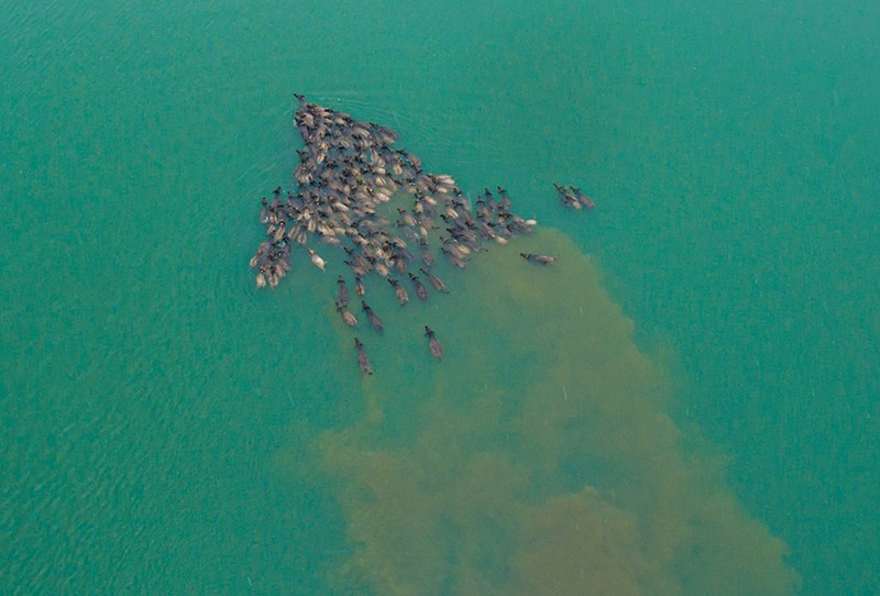 当天上午10时,在油房沟景区,随着雄浑、古朴的牛角号吹响,江边栅栏门一打开,早已等候在此的大大小小、老老少少的牛儿们按捺不住欣喜的心情,争先恐后地冲进嘉陵江,浩浩荡荡地向着水草丰茂的江心太阳岛游去。在江中,牛儿们不时变换着队形,跳起了“水上芭蕾”,经过四五分钟破浪前行,登上了太阳岛,开始欢快地啃食着岛上的青草。