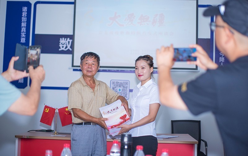 袁龙现场把《大爱无疆》袁龙战役歌曲汇编赠送给了杨红艳为代表的一线抗疫英雄。