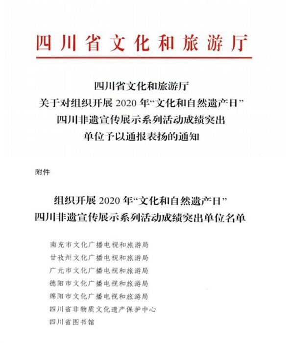 8月11日,四川省文化和旅游厅发出通知,对组织开展2020年“文化和自然遗产日”四川非遗宣传展示系列活动成绩突出的单位予以通报表扬,南充市文化广播电视和旅游局等7家单位受到表扬。