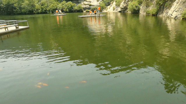清凉湖四面环山,碧波荡漾,和相爱的人共渡竹筏,一起欣赏小船儿推开波浪的美好时光。