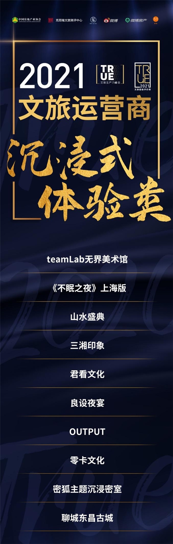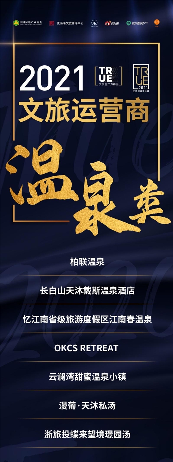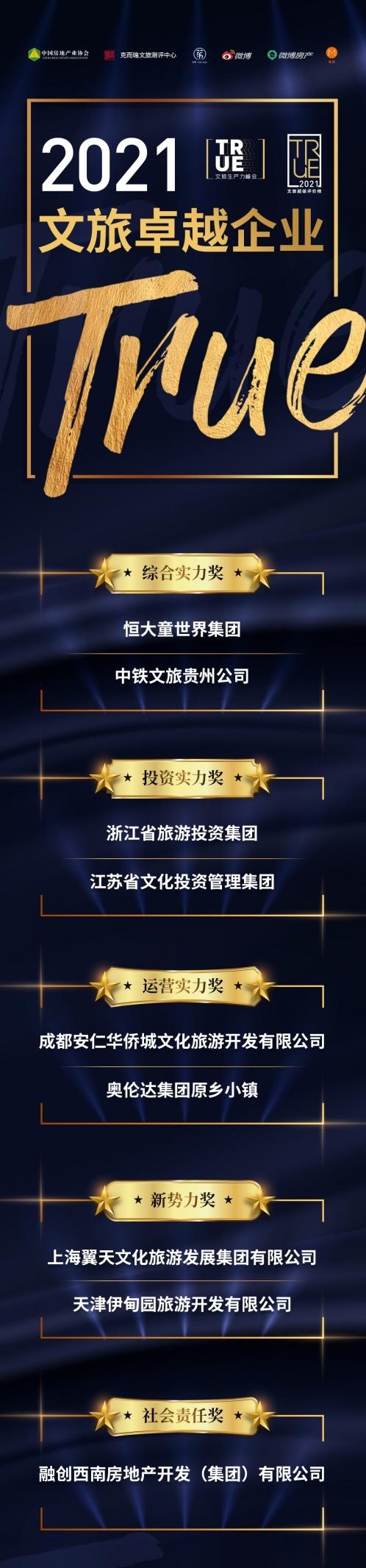 2021年,克而瑞文旅测评中心权威发布了文旅行业官方指向标“TRUE文旅超级评价榜”(克而瑞文旅测评中心由中国房地产业协会商业和文化旅游地产委员会、易居克而瑞、克而瑞乐苇、微博房产共同组成)。本次TRUE 榜设立了项目、企业、运营三大奖项。