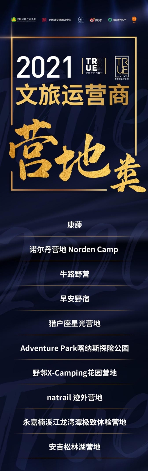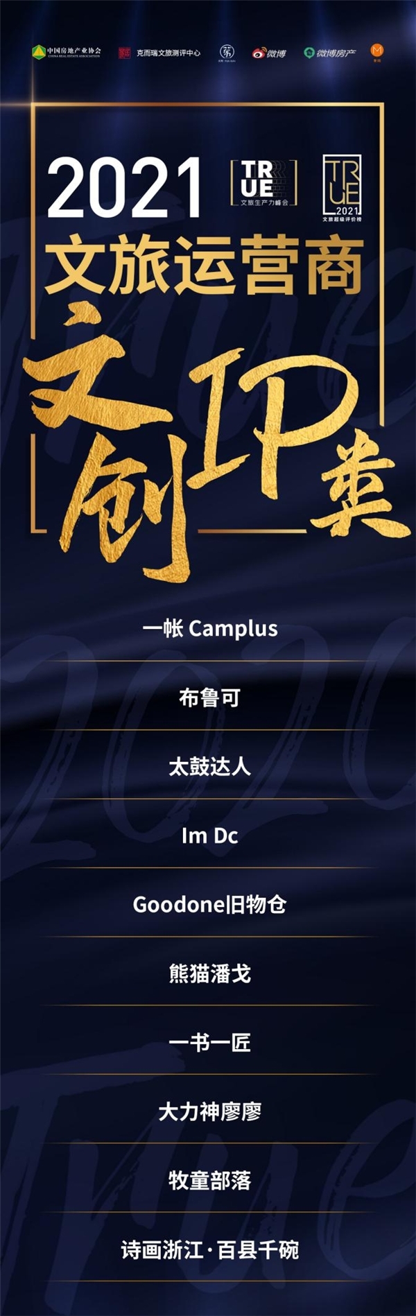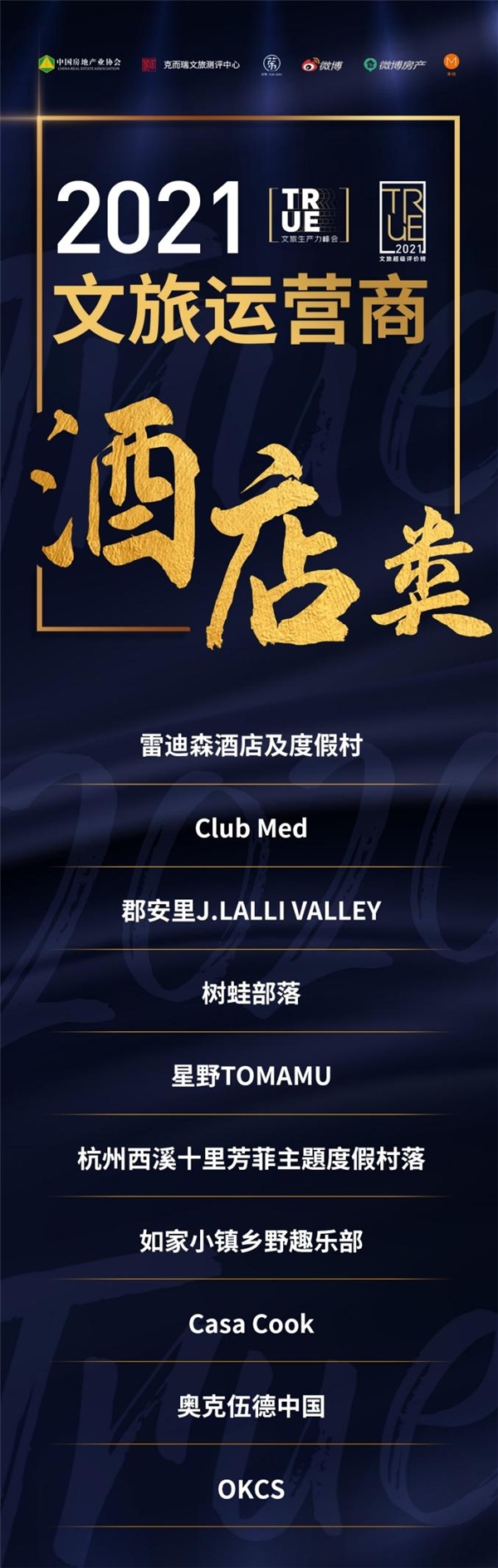 发展历程:2020年1月,为构建文旅行业价值体系,由中国房地产业协会商业文化旅游地产委员会、易居克而瑞、新浪微博房产、麦咭传媒联合发布的2020年文旅地产项目超级评价榜(简称:2020文旅地产TRUE榜)应运而生,《2019中国最佳文旅地产项目 TOP20》、《2020中国最期待文旅地产项目 TOP》两大奖项正式设立。