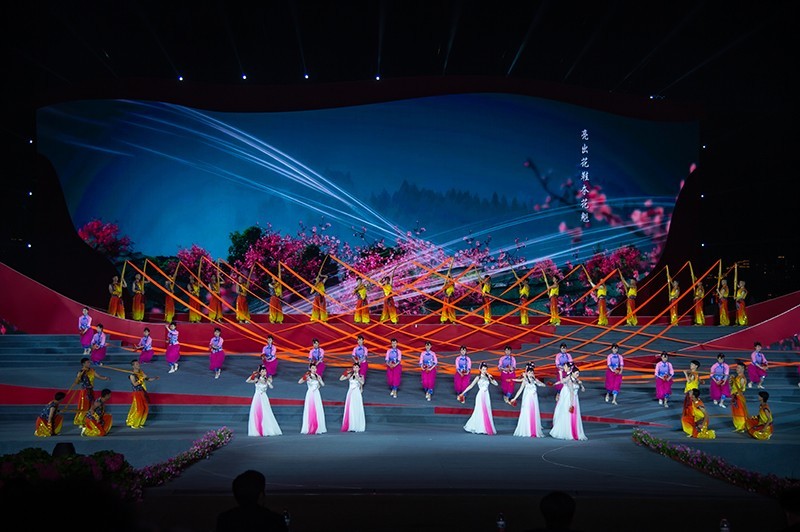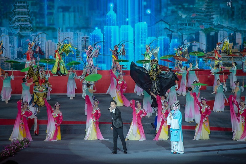 文艺演出在情景表演唱《嘉陵江号子》嘹亮的船工号子声中拉开了帷幕,接着戏曲歌舞《川渝》、情景歌舞《火辣辣的城》、情景歌舞《看山看水看四川》、歌舞《黄杨扁担》、情景表演唱《亮花鞋》、歌舞《嘉陵江上大舞台》、情景歌舞《红船》、情景歌舞《七律·长征》、歌舞《保卫黄河》、情景小合唱《绣红旗》、歌舞《歌唱祖国》等节目轮番上演,整场演出气势磅礴、如梦如幻、如诗如画,给现场5000余名观众带来了巨大震撼和视听享受。