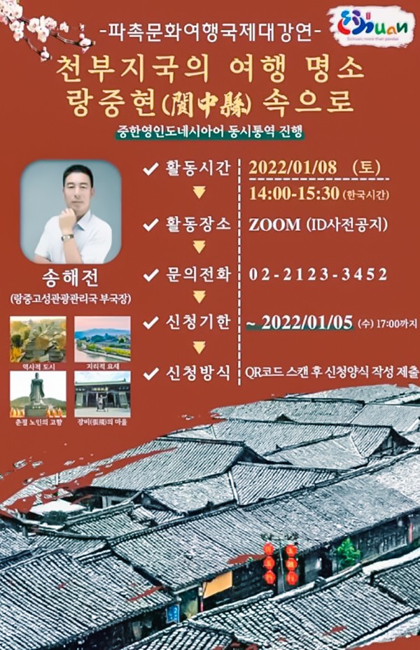 2022年春节前,巴蜀文旅国际大讲堂首期选择在阆中,将向世界介绍“中国春节文化之乡”最正宗的年味儿。阆中古城是古代巴人活动中心和古蜀道、嘉陵江的重要节点,巴文化、三国文化、蜀道文化在这里蓬勃发展。阆中古城景区管理局宋海全副局长将从山川地貌、人文历史、民风民俗、特产名品四个维度开展一场独具特色的在线直播讲座,并首次融入VR体验,带领中外游客感受到阆中古城的独特魅力,体验丰富多彩的春节文化。